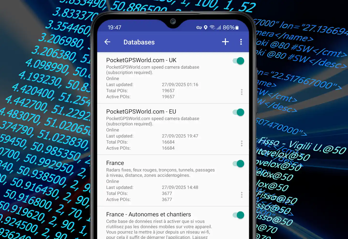 The app supports multiple radar databases in different formats. You can download your database from your cloud storage, phone SD-card, or even by direct link. If you use database with directions in IGO8 format, you'll receive warnings only when you're approaching to speed camera in right direction without false warnings for other cameras.